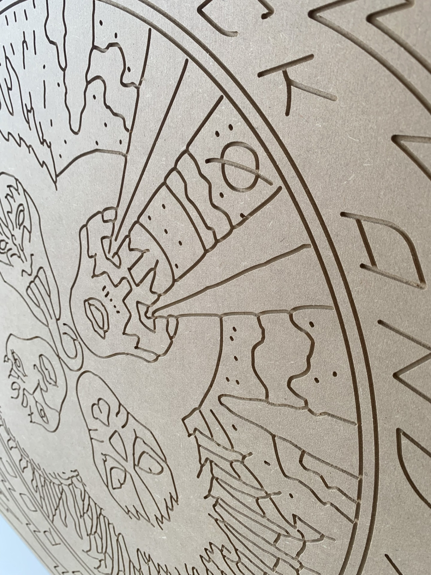 Cada diseño está realizado en MDF crudo de 60 × 60 cm, con acabado artesanal y un soporte incluido para que puedas colgarlo fácilmente en la pared.